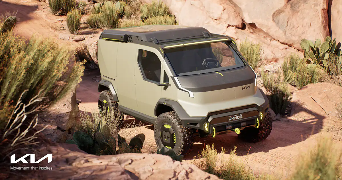 Базований на лінійці Kia Purpose Beyond Vehicles (PBV), концепт PV5 WKNDR створений для тих, хто шукає практичність. Цей електричний вантажний вен отримав підйом підвіски та позашляхові шини, що робить його зручним вибором для виїздів на природу.