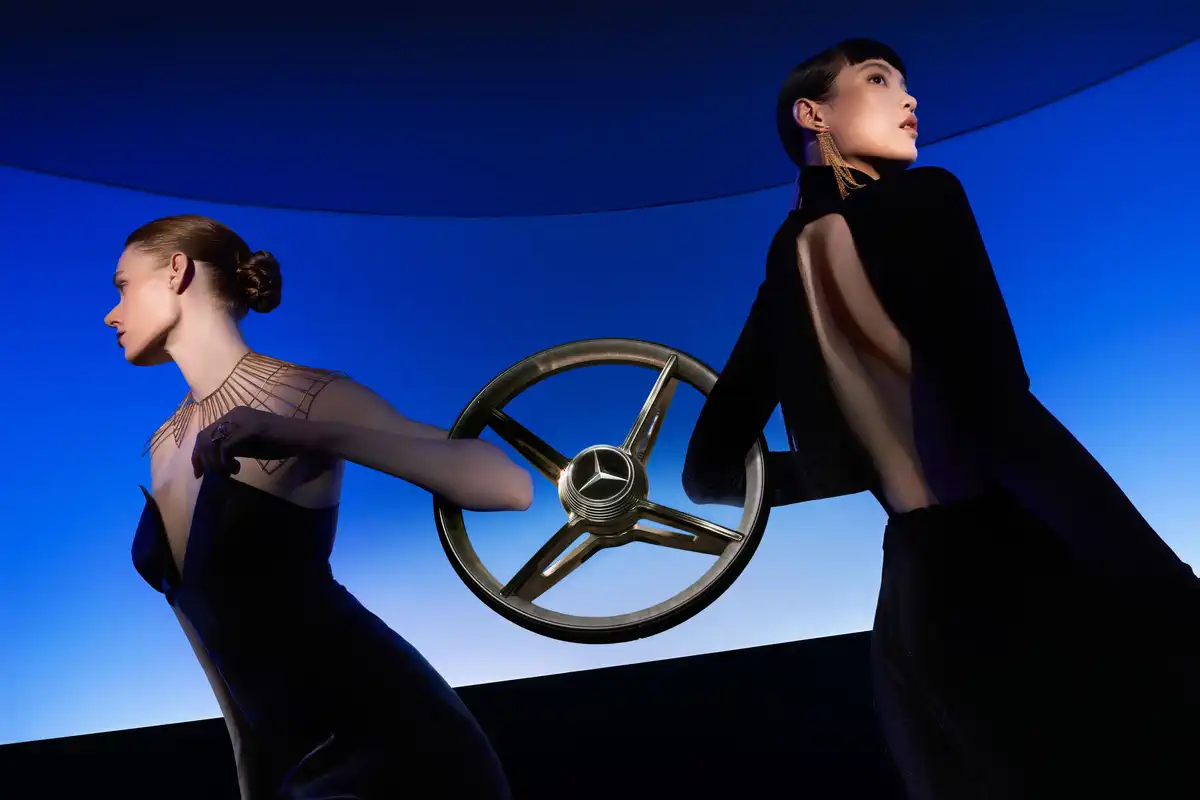 Mercedes пішов далі і створив шість моделей одягу для чоловіків і жінок, які відображають стиль Vision Iconic. Темно-сині відтінки, срібно-золотисті акценти, графічні елементи з інтер’єру шоу-кара — все це данина поваги Shanghai Fashion Week, що відбувається під час прем’єри концепту.