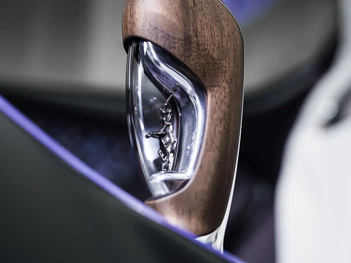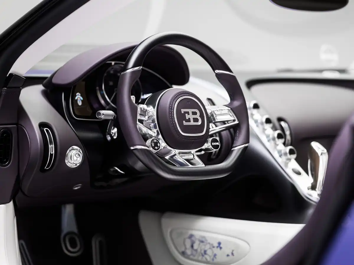 У центрі салону — ще один символ: фігурка “Танцюючого слона” Рембрандта Бугатті, розміщена під склом із фіолетовим відтінком. Вона поєднує сучасний дизайн із художньою спадщиною бренду.