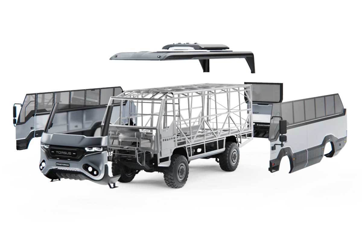 Головна відмінність Torsus Praetorian у тому, що обшивка кузова не металева, а виконана з композитних матеріалів. Вони легші за метал, дає змогу робити ширший спектр форм, але найголовніше — композитні матеріали не іржавіють.