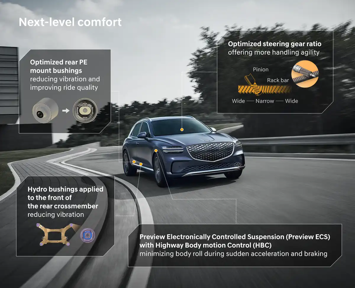 Покращення стосуються не лише естетики й потужності. В оновленій версії GV70 використано нові гідроопори підвіски ззаду, що знижують вібрації, а також оптимізоване передавальне відношення рульового механізму, що покращує реакцію на кермо.