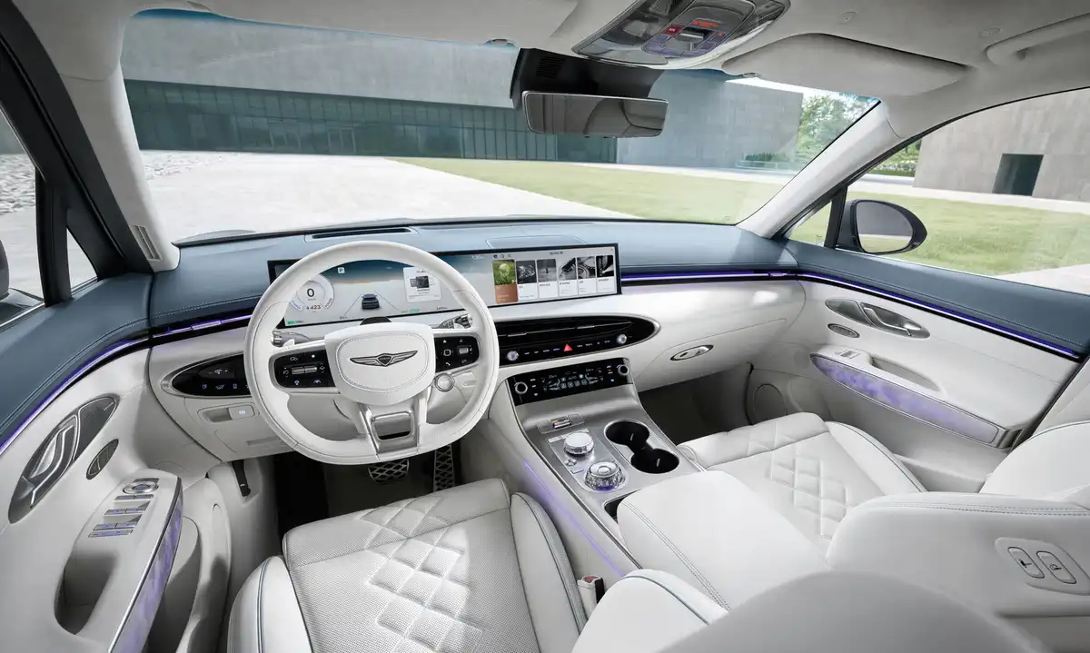 Усередині GV70 переважає принцип “краса білого простору”, який поєднує мінімалізм і технологічність. Центральним елементом став 27-дюймовий широкий дисплей, який об’єднує панель приладів і мультимедіа в одному горизонтальному екрані. Кермо оновлено — з новим логотипом і покращеним оздобленням.