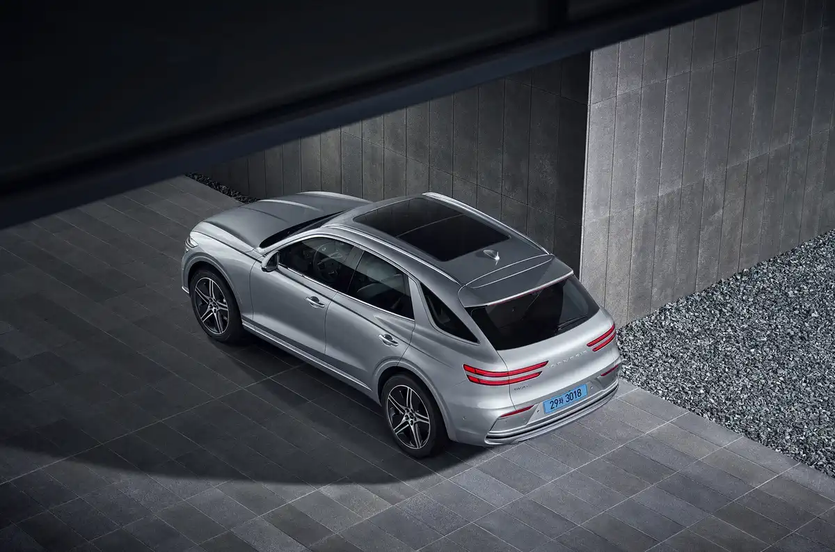 Нова решітка радіатора Crest з об’ємною G-Matrix-структурою створює глибокий візуальний ефект і підкреслює електричну сутність авто. Передній бампер набув масивнішої форми, а фари з новою технологією Micro Lens Array не лише краще освітлюють, а й надають автомобілю технократичного вигляду.