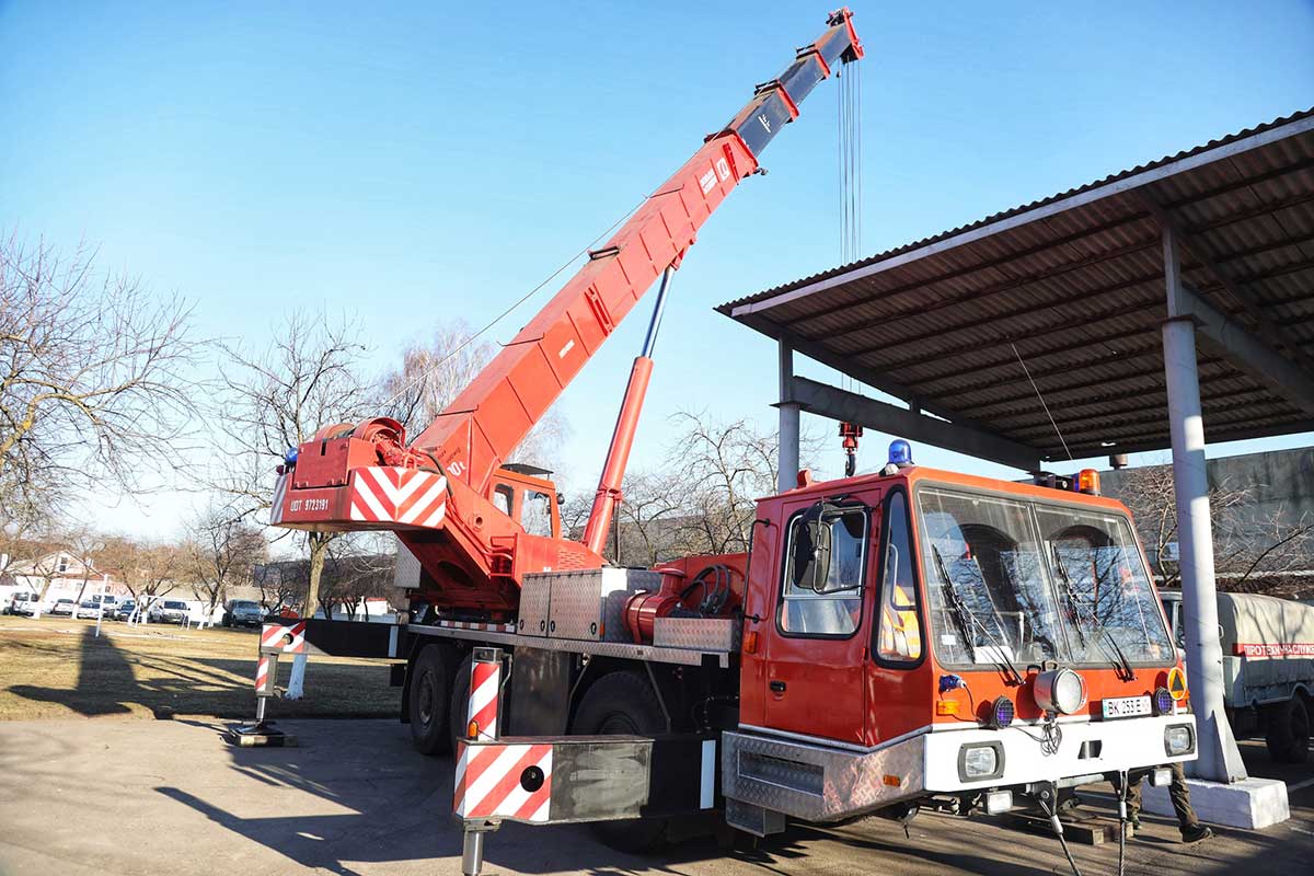 Хочеться відзначити пожежну драбину-підйомник на тривісному шасі Volvo FL12. Заслуговує на увагу і 30-тонний автокран польської марки Bumar.